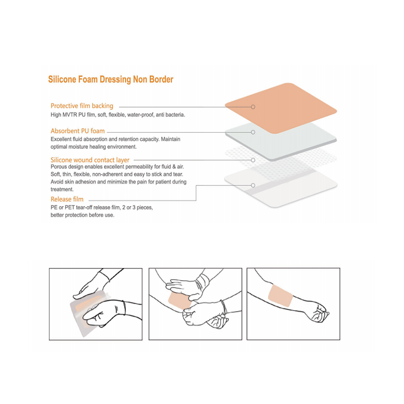 การแต่งตัวโฟมซิลิโคนที่ไม่มีขอบเป็นรูปแบบการตกแต่งด้วยตนเองประกอบด้วยการสำรองฟิล์มป้องกันโฟม PU ที่ดูดซับได้ชั้นการสัมผัสแผลซิลิโคนและฟิล์มปล่อยส่วนใหญ่จะใช้สำหรับบาดแผลเรื้อรังและเฉียบพลันที่มีระดับปานกลางถึงสูง