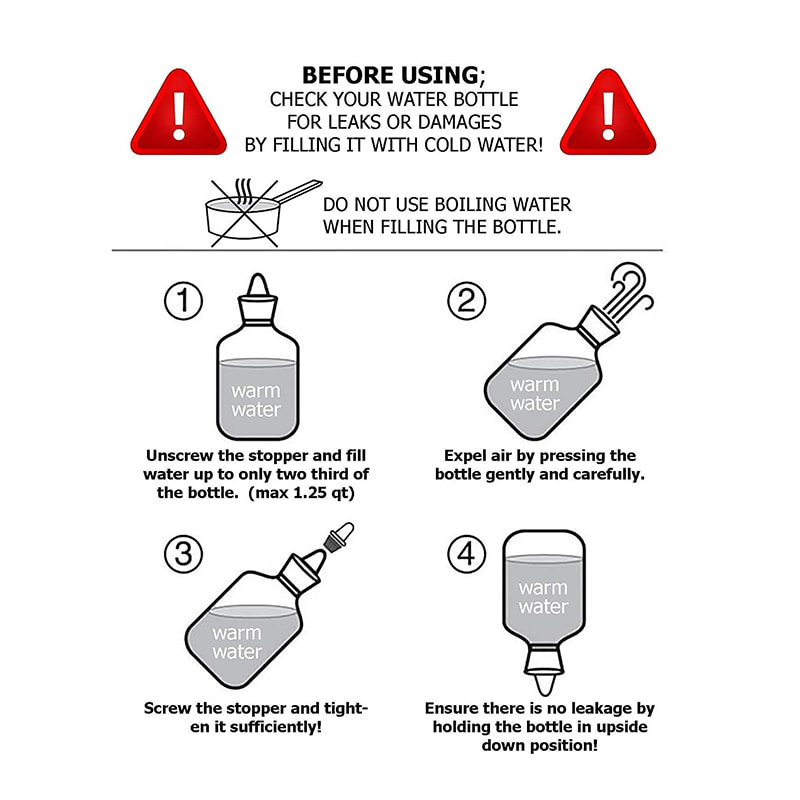 ขวดน้ำร้อนสามารถใช้เพียงอย่างเดียวเพื่อเป็นยาสำหรับอาการปวดเมื่อย, ปวดและการบาดเจ็บกีฬาเช่นหลัง, อาการปวดคอและไหล่, กล้ามเนื้อเจ็บ, ปวดประจำเดือนและความตึงเครียด
