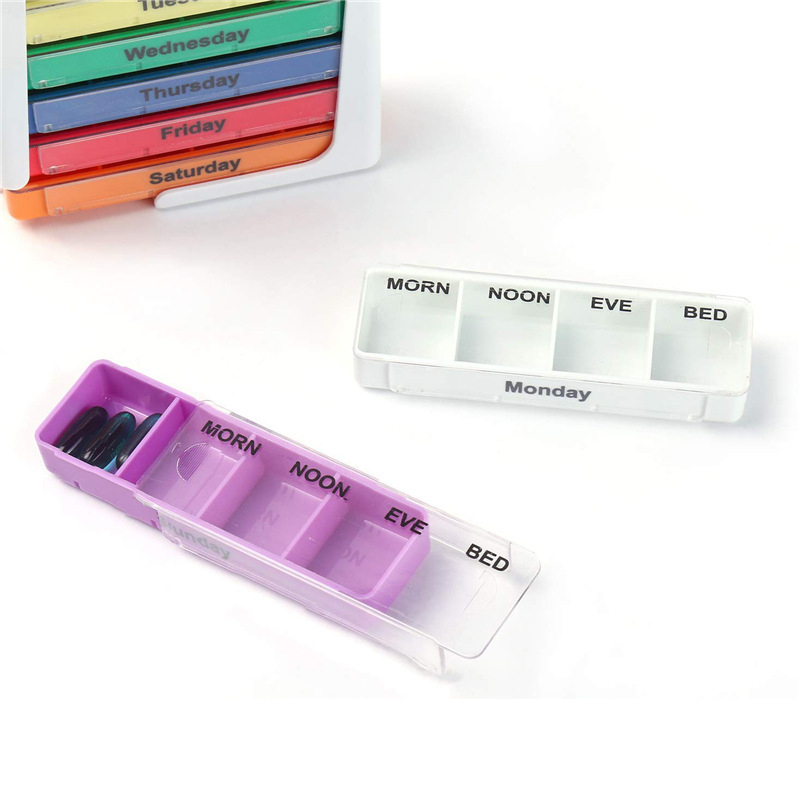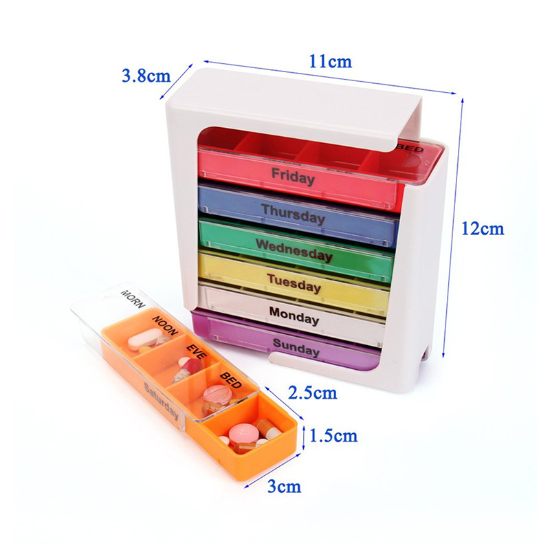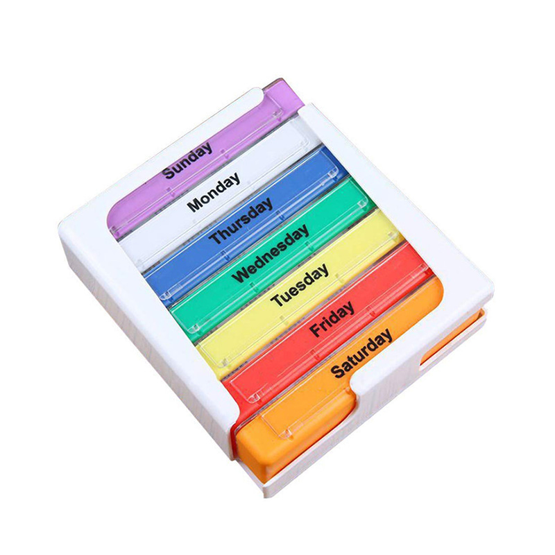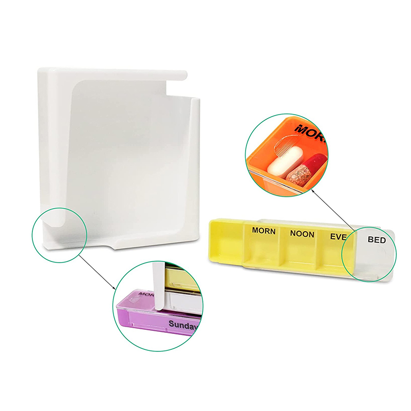 เคสด้านนอกได้รับการออกแบบโปร่งใสและแต่ละถาดมีสีสดใสที่ไม่ซ้ำกันสำหรับผู้ใช้เพื่อแยกความแตกต่างของวันในสัปดาห์ได้อย่างง่ายดาย
