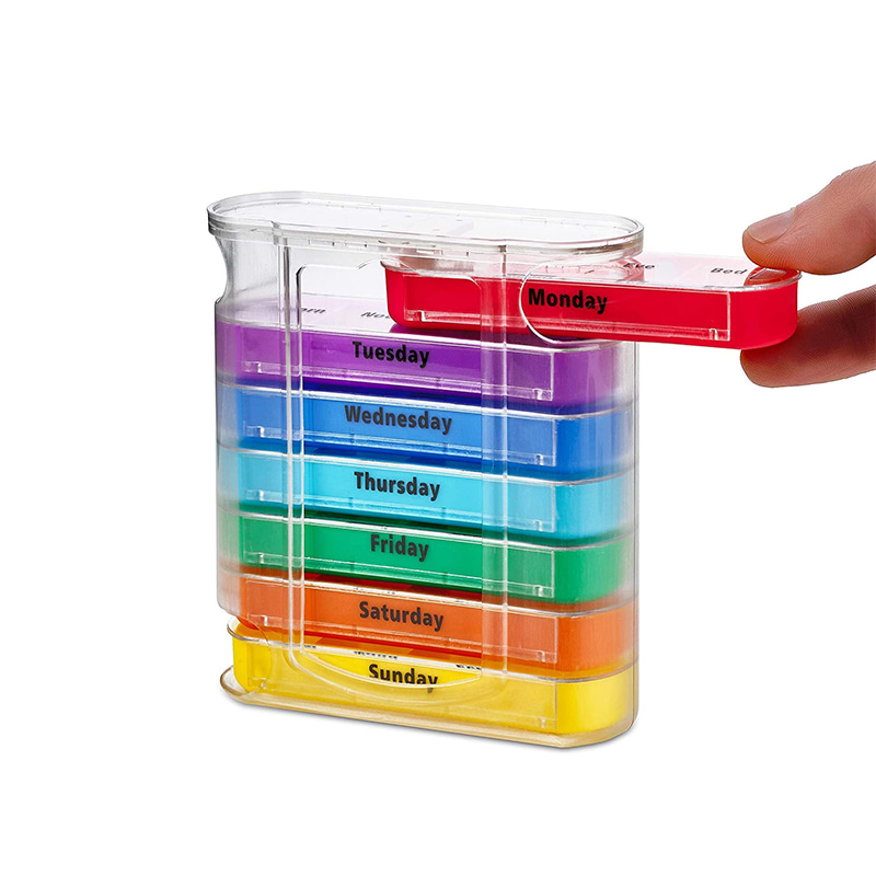 เคสด้านนอกได้รับการออกแบบโปร่งใสและแต่ละถาดมีสีสดใสที่ไม่ซ้ำกันสำหรับผู้ใช้เพื่อแยกความแตกต่างของวันในสัปดาห์ได้อย่างง่ายดาย
