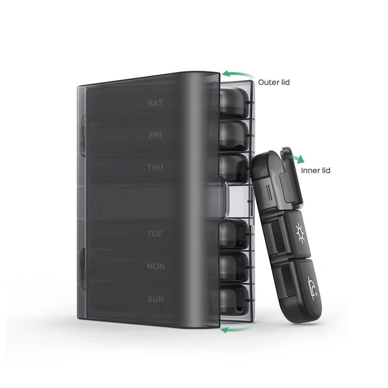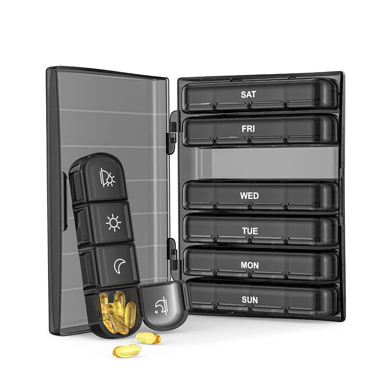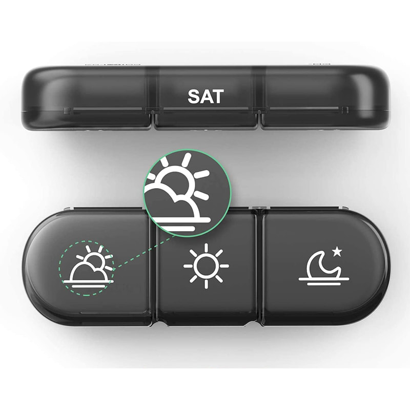 เปลือกดำขนาดใหญ่สามารถรองรับผู้จัดกล่องยาอิสระ 7 ตัวเพื่อวางแผนยาเม็ดเป็นเวลาหนึ่งสัปดาห์