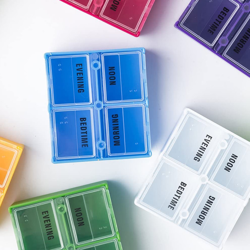 แต่ละช่องจะถูกคั่นด้วยฝาปิดแบบเปิดง่ายสี่ตัวเพื่อให้คุณสามารถรู้ได้ว่าจะทานยาชนิดใดทุกครั้ง!