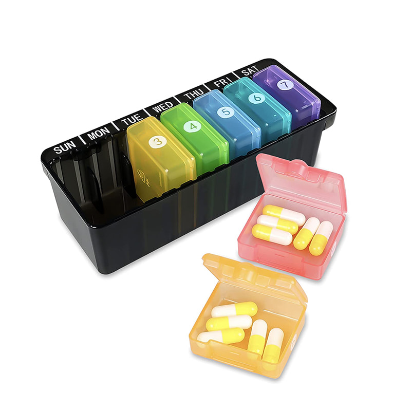 ผู้จัดยารายสัปดาห์ของเรามีขนาดกะทัดรัด แต่มีความสามารถเพียงพอที่จะเก็บน้ำมันปลา 6 ตัวหรือวิตามินขนาดใหญ่ 9 ตัวหรือ 15 แคปซูลสำหรับการใช้งานประจำวัน
