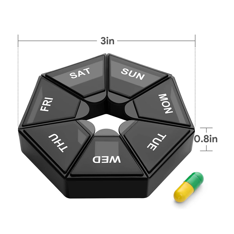 เส้นผ่านศูนย์กลาง 4 นิ้วมีขนาดใหญ่กว่ากล่องยา 7 ด้านอื่น ๆ มีขนาดใหญ่พอที่จะเก็บยาทุกวันได้มากขึ้น