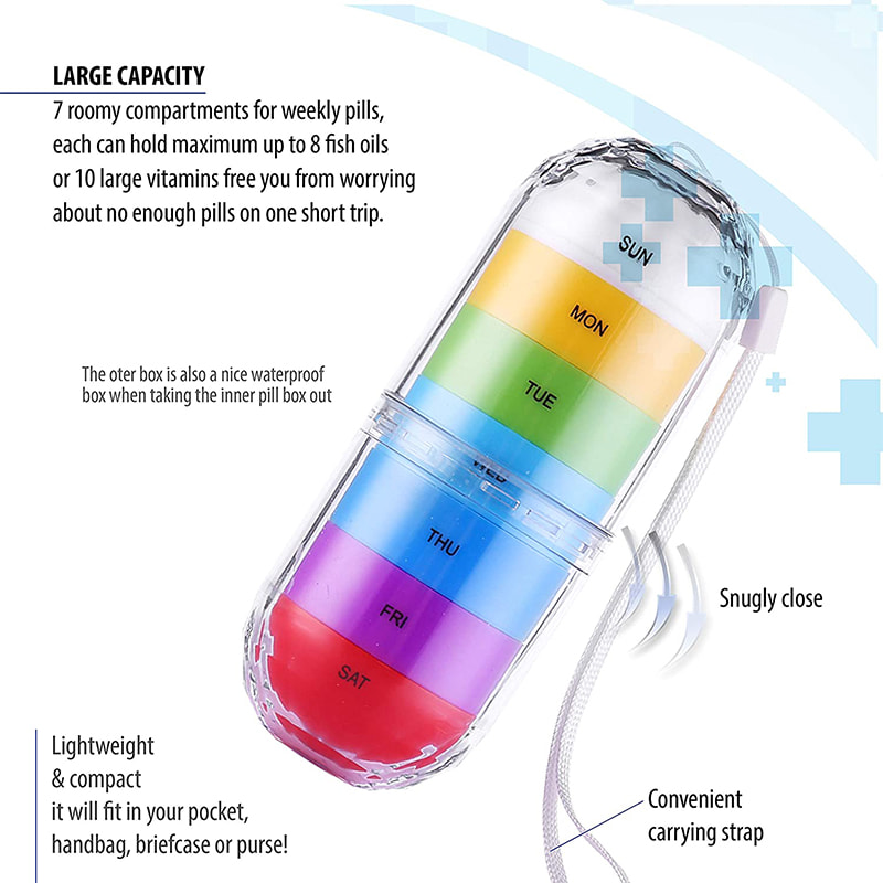 1 คอนเทนเนอร์ด้านนอกที่มีสายรัดและแต่ละกรณี 7 วันเพื่อหลีกเลี่ยงการหกโดยไม่ตั้งใจและรักษายาให้ปลอดภัยแห้งและอยู่ห่างจากความชื้น ไม่เปิดโดยอัตโนมัติเมื่อกด เชือกที่ติดอยู่กับชุดทำให้ง่ายต่อการพกพา